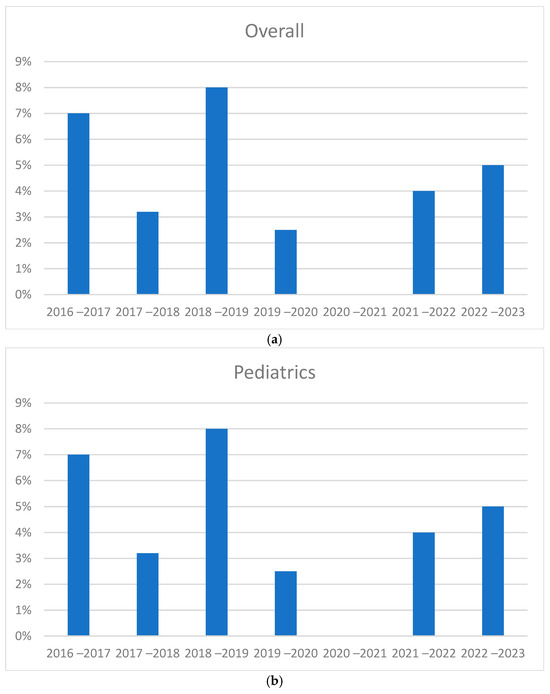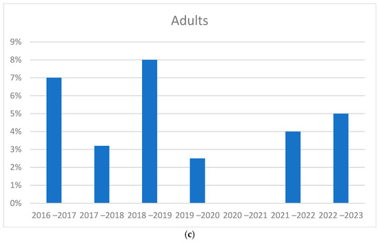 An evaluation for absolute numbers was carried out to check for any variations in the years (Figure 3). The growth trend was increasing before the pandemic. Starting from the positivity rate in pediatrics, no significant increase or difference was observed in the post-pandemic period. While considering the absolute numbers in pediatrics, there was an increase in cases in seasonal peaks during 2021–2022 and 2022–2023 compared to previous years. In adults, an increase in positivity rates was not seen in the post-pandemic period. In terms of absolute numbers, an increase in cases was found in 2022–2023, while in the previous year positivity was found to be like the pre-pandemic period.