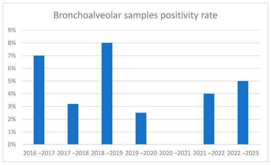 In bronchoalveolar samples, positivity rates were found to be higher in the pre-pandemic period than in the post-pandemic period (Figure 4). Meanwhile, in the analysis of absolute values, more cases were found in the periods following the pandemic. It should be considered that in this case, the psitive samples are much fewer than the swabs (about ten per year); therefore, the variations between the epidemic peaks are scarcely relevant.