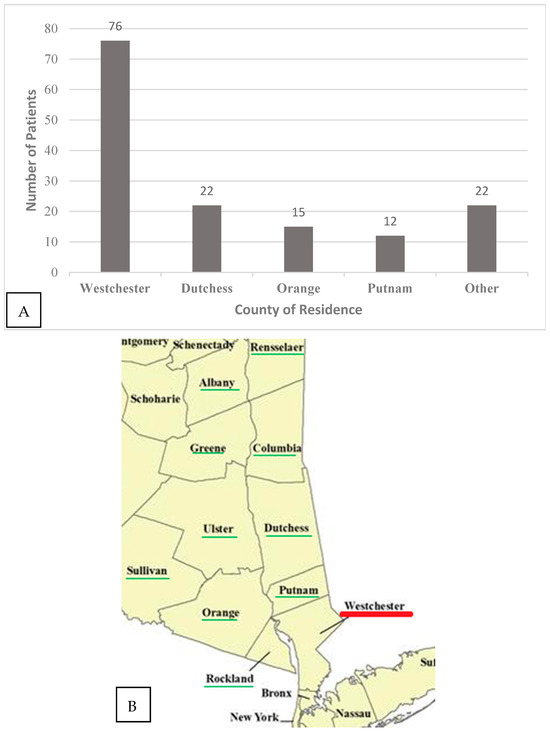 This retrospective chart review study is the largest single-center study to describe the clinical manifestations and outcome of babesiosis in the lower Hudson Valley of New York State where babesiosis is endemic, along with Lyme disease and anaplasmosis. All three diseases are transmitted through the bite of the deer tick I. scapularis [3]. Patients commonly present with a single infection, but coinfections should be also considered in certain cases where presentation is atypical or more severe [11]. Babesiosis was one of the emerging tick-borne infections in this region during 2011–2019, as the incidence of babesiosis in the U.S. significantly increased in northeastern states. Some states that were not considered endemic still exhibited a significant increase in reported cases similar to or even higher than those classified as endemic states [6]. Babesiosis can result in an asymptomatic infection or minimal symptoms in 40% of children and 20% of young and healthy adults, for which patients seldom seek medical care [12]. In the elderly and patients with comorbidities, the infection may result in significant morbidities and even death, with a rate ranging from 1.6% to 21% [7,13,14,15].
