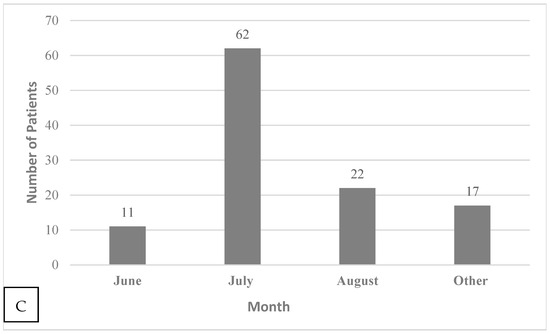 The mean age was 64.1 ± 16.2 years; 69% were males. On average, patients with severe babesiosis were 12 years older than non-severe cases (Table 1). The majority of patients resided in Westchester, Dutchess, Orange, or Putnam County (Figure 1A,B). Most (77%) patients were admitted in July and August (Figure 1C). A heatmap is also provided below (Figure 2) for comparison to show the distribution of cases across 40 states. Only 18% of patients could recall being bitten by a tick within the 2 weeks prior to admission (Table 1).