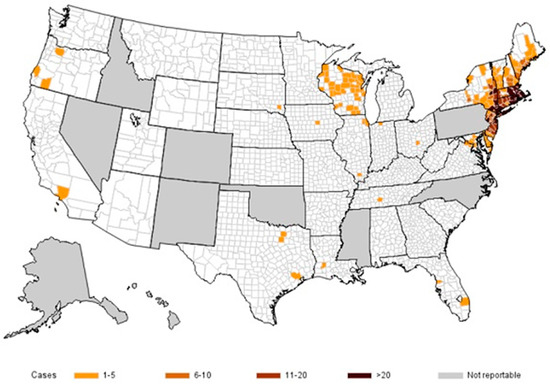 Heatmap of the United States showing the number of reported cases of babesiosis by county of residence for 40 states in 2020. The map is developed by the CDC’s National Center for Emerging and Zoonotic Infectious Diseases (NCEZID) and is available on the agency website for no charge [10].