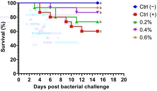The bacterial cells were harvested by centrifugation at 3000× g for 10 min, washed twice with sterile phosphate-buffered saline (PBS) to remove residual culture media, and resuspended in PBS before injection. The different experimental groups (in three replicates) then received an intraperitoneal injection of 0.2 mL of a suspension containing 1 × 10⁸ CFU/mL of A. hydrophila, as described by Moustafa et al. [44]. Mortality was monitored over a 14-day observation period according to the methods outlined by Naiel et al. [45]. The fish continued to receive their designated diets during this period. Cumulative survival rate was calculated using the following formula: