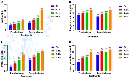 Pre- and post-challenge serum immunoglobulin M (IgM) levels (A), phagocytic activity (B), phagocytic index (C), and lysozyme activity (D) in Nile tilapia fed diets supplemented with 0%, 0.2%, 0.4%, and 0.6% Mentha piperita (peppermint) for 90 days and challenged with Aeromonas hydrophila. Data are expressed as the mean ± SEM. Values with different letter superscripts are significantly different between groups.