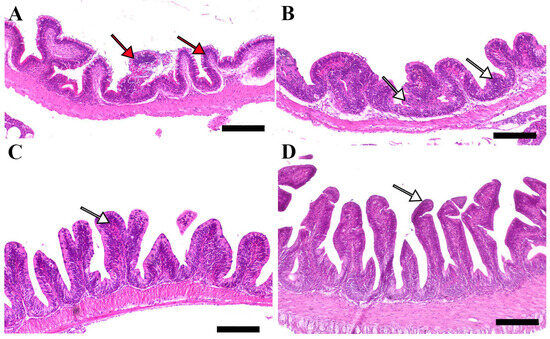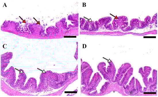 Representative histomorphological features (post-challenge) of H&E-stained sections from the anterior intestine of Nile tilapia fed diets supplemented with (A) 0%, (B) 0.2%, (C) 0.4%, or (D) 0.6% Mentha piperita (peppermint) for 90 days, followed by challenge with Aeromonas hydrophila. Red arrows indicate atrophic degenerative changes in the intestinal folds, while white arrows highlight normal intestinal folds. Scale bars = 100 μm.