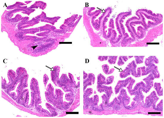 Representative histomorphological features of H&E-stained sections from the middle intestine of Nile tilapia fed diets supplemented with (A) 0%, (B) 0.2%, (C) 0.4%, or (D) 0.6% Mentha piperita (peppermint) for 90 days, followed by challenge with Aeromonas hydrophila. Black arrowheads indicate focal infiltration of inflammatory cells, while white arrows point to normal intestinal folds. Scale bars = 100 μm.