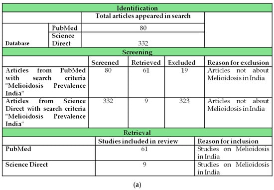 Selection of articles from PubMed and Science Direct: (a) with search words “melioidosis prevalence India”; (b) with search words “melioidosis risk factor India”. The articles with no relevance to melioidosis in India were excluded.