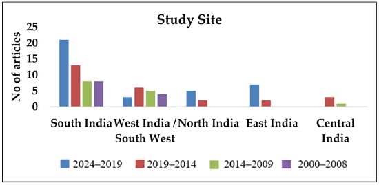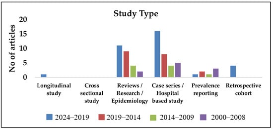 This study comprehensively reviews literature obtained from PubMed (total articles retrieved: 96) and Science Direct (total articles retrieved: 31), focusing on two specific search criteria, “melioidosis prevalence India” and “melioidosis risk factor India”, as shown in Figure 1a,b. The search was conducted for articles published during the last two decades, covering the years 2000–2024, and grouped into four distinct time periods, 2024–2019, 2019–2014, 2014–2009, and 2008–2000, as detailed in Supplementary Table S1 [1,7,27,32,40,63,64,65,66,67,68,69,70,71,72,73,74,75,76,77,78,79,80,81,82,83,84,85,86,87,88,89,90,91,92,93,94,95,96,97,98,99,100,101,102,103,104,105,106,107,108,109,110,111,112,113,114,115,116,117,118,119,120,121,122,123,124,125,126] and Table S2 [11,12,27,33,49,66,67,68,69,127,128,129,130,131,132,133,134,135,136,137,138,139,140,141,142,143,144,145,146,147,148,149,150,151,152,153,154,155,156,157,158,159,160,161,162,163,164,165,166,167,168,169,170,171]. Relevant articles were selected based on their relevance to the epidemiology and risk factors associated with melioidosis in India. The retrieved studies were analyzed for key findings regarding the prevalence of melioidosis, the identification of risk factors, and trends over time, aiming to provide a comprehensive overview of the disease’s impact in India during the specified periods.