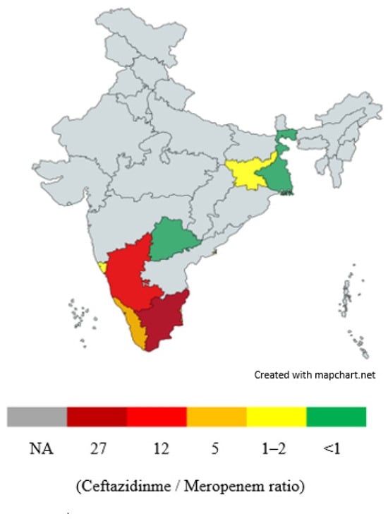 Furthermore, as seen in Figure 8, the ratio of ceftazidime to meropenem consumption among melioidosis patients, as documented by Mukhopadhyay et al. [172], indicates a preference for ceftazidime over meropenem in the following states, ranked from highest to lowest preference: Tamil Nadu, Karnataka, Kerala, Odisha, Goa, Telangana and West Bengal.