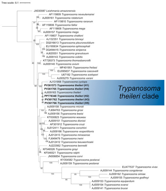 Phylogenetic reconstruction of the genus Trypanosoma based on partial 18S rRNA gene sequences obtained in this study (in bold) and from GenBank. The dataset included 51 sequences and 2755 nucleotide sites. The tree was inferred using maximum likelihood with the TIM2e+I+G4 model. Bootstrap values <80% were omitted. Leishmania amazonensis served as the outgroup. The Trypanosoma theileri clade is highlighted in blue. Haplotypes (H) are indicated in parentheses.
