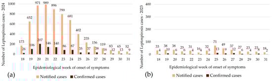 Distribution of leptospirosis cases notified and confirmed by epidemiological week of onset of symptoms (a) during the flood period (1 May to 31 July 2024) and (b) during the same period in the previous year (1 May to 31 July 2023), Rio Grande do Sul, Brazil. The scale in (a) (0 to 1000) is 2.5 times higher than the scale in (b) (0 to 400).