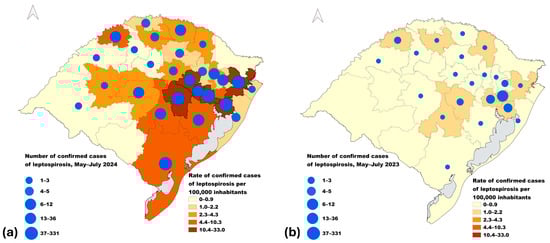During the catastrophic flood period analyzed in this study (1 May to 31 July 2024), 6273 suspected cases of leptospirosis were reported to the state health surveillance center, of which 958 (15.3%) were confirmed by different diagnostic methods, including 464 confirmed by clinical–laboratory criteria. During the same period in the previous year, 461 suspected cases were reported, with 93 confirmed (20.2%), including 73 by clinical–laboratory criteria.