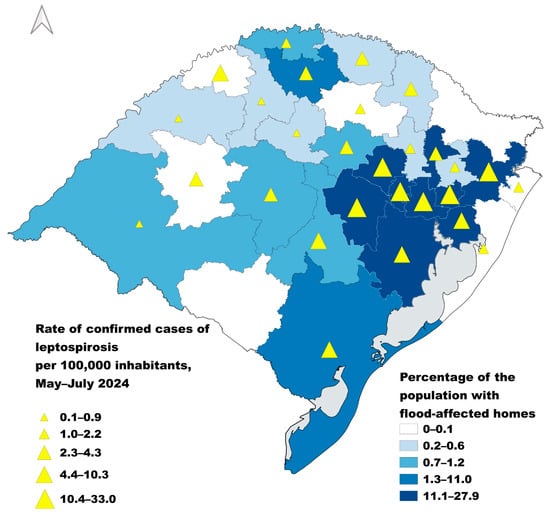 The 2024 catastrophic flood in Rio Grande do Sul is considered the worst climate disaster in the state’s history, affecting over 2.3 million people [33,35,45]. Given the scale of this event, a surge in leptospirosis cases was anticipated, following patterns observed in similar flood events across the Americas and other regions [2,8,10,46,47,48]. During the event, a total of 958 cases of leptospirosis were identified (a 10.3-fold increase compared to the previous year), and 30 deaths were caused by the disease (a 6.0-fold increase). Understanding the extent of this increase and identifying the most affected areas are critical for decision-makers when planning an effective public health response.