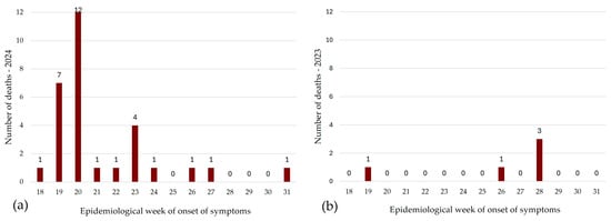 During the three months of the event, 30 deaths from leptospirosis were confirmed; among them, 3 were females (10.0% of the cases). Most of the deaths were in the productive age group; the age group with the highest percentage was 50–59 years (36.7%). Considering the 958 confirmed cases, the case fatality rate was 3.1%. The fatality rate by age group for individuals 50 years old or over ranged from 7.0% (50–59 years) to 13.3% (70 years or older), higher than that for the younger age groups (ranging from 0 to 1.5%). During the same period in 2023, five deaths were confirmed (one female), two in the 30–39 age group and three in the 60–69 age group (Table 3). Comparing the 5 deaths among the 93 confirmed cases in 2023 (case fatality rate of 5.4%), lethality during the flood was lower. Nevertheless, the increase in the number of deaths was 6.0-fold. Nineteen out of thirty deaths had the onset of symptoms during weeks 19 and 20, one to two weeks after the beginning of the flood (Figure 4).