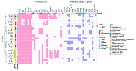 Heatmap of virulence genes and antibiotic resistance genes of 24 S. parasuis and 8 serotype 2 S. suis strains.