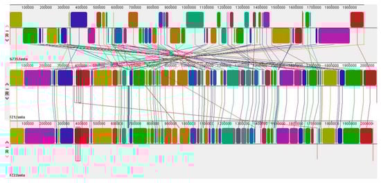 The massive quantities of bacterial genomic data generated have facilitated in-depth analyses of bacteria for pangenomic studies []. Different numbers of accessory and unique genes were present in 24 S. parasuis. These dispensable genes and strain-specific genes are categorized as secondary genes, delineating the partially shared and strain-specific attributes of a species. These characteristics distinguish strains from one another and contribute to species diversity. Partially shared and strain-specific genes play roles that are not essential for growth but provide selective advantages, such as adaptation to different hosts and antibiotic resistance, indicating that owing to the presence of accessory genes and specific genes, S. parasuis is diverse. Structural variation in bacterial genomes is an important evolutionary driver. Genomic rearrangements, such as inversions, duplications, and insertions, can regulate gene expression and promote niche adaptation [].