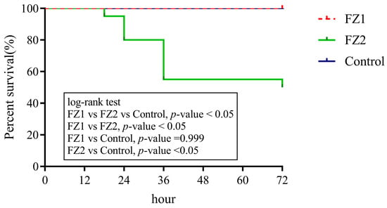 An experimental infection model in mice was designed to assess the pathogenicity of S. parasuis strains FZ1 and FZ2 by comparing the survival rates of infected mice. A total of 50 female C57BL/6 mice (6 weeks old) were randomly allocated into two infection groups (2 replicates per group, 10 mice per replicate) and one control group (2 replicates, 5 mice per replicate). C57BL/6 mice were intraperitoneally injected with 5 × 107 CFUs of test strains in 1 mL of THB or THB alone (control). Mortality was recorded every 6 h for the first 24 h and every 12 h thereafter 72 h post-infection. Survival curves were generated using the Kaplan–Meier method, and experiments were performed in duplicate [].