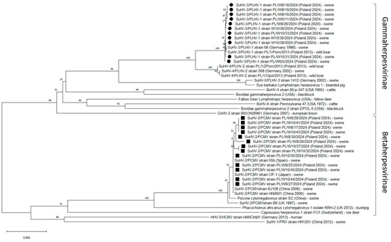 Neighbour-joining phylogenetic tree of selected herpesviruses of humans and animals constructed based on partial sequencing of DNA polymerase gene. Viruses infecting mainly swine or wild suids are marked with respective silhouettes. AlHV-1—alcelaphine (wildebeest) herpesvirus 1, BbabRHV-1—Babyrousa babyrussa rhadinovirus 1, BoHV-1—bovine alphaherpesvirus 1, BoHV-2—bovine alphaherpesvirus 2, BoHV-4—bovine gammaherpesvirus 4, BoHV-5—bovine alphaherpesvirus 5, BoHV-6—bovine gammaherpesvirus 6, CvHV-1—cervid herpesvirus 1, EHV-1—equid alphaherpesvirus 1, EHV-4—equid alphaherpesvirus 4, fallow deer LHV—fallow deer lymphotropic gammaherpesvirus, HHV-1/HSV-1—human alphaherpesvirus 1/herpes simplex virus 1, HHV-4/EBV—human gammaherpesvirus 4/Epstein-Barr virus, HHV-5—human betaherpesvirus 5, HHV-6A—human betaherpesvirus 6A, HHV-7—human betaherpesvirus 7, OvHV-2—ovine herpesvirus 2, PafrCMV-1—Phacochoerus africanus (warthog) cytomegalovirus 1, SbarLHV-1—Sus barbatus (bearded pig) lymphotropic herpesvirus 1, SuHV-1/PRV—Suid herpesvirus 1/pseudorabies virus, SuHV-2/PCMV—Suid herpesvirus 2/porcine cytomegalovirus, SuHV-3/PLHV-1—Suid herpesvirus 3/porcine lymphotropic herpesvirus 1, SuHV-4/PLHV-2—Suid herpesvirus 4/porcine lymphotropic herpesvirus 2, SuHV-5/PLHV-3—Suid herpesvirus 5/porcine lymphotropic herpesvirus 3.