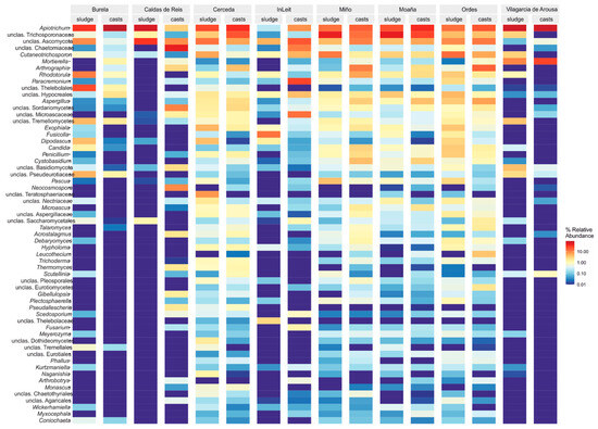 Heatmap of the 60 most abundant fungal genera found in sewage sludge from eight WWTPs, as well as after transit through the gut of the earthworm Eisenia andrei. The mean values for both sewage sludge and earthworm casts are displayed.