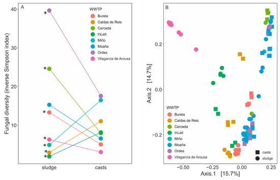 Changes in fungal diversity of sewage sludge from several WWTPs before and after passage through the gut of the earthworm species Eisenia andrei are shown as (A) alpha diversity estimated using the inverse Simpson index and (B) beta diversity determined by principal coordinate analysis of Bray–Curtis distances. Asterisks in panel A indicate significant differences between sewage sludge and earthworm casts within each WWTP (paired t-test, FDR-corrected).