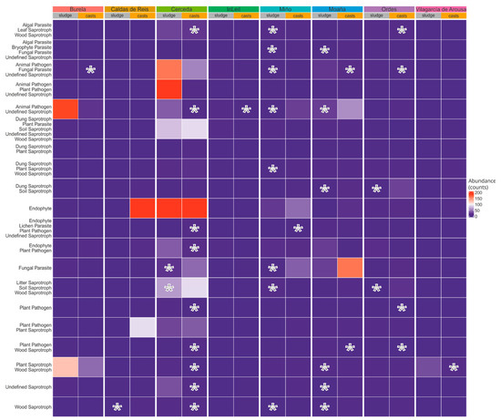 Heatmap of high-abundance fungal guilds present in sewage sludge and earthworm casts from different WWTPs. The mean abundance in sequence counts is shown. Asterisks indicate significant differences between sewage sludge and fresh earthworm casts (paired t-test, FDR-corrected). The position of the asterisks indicates either a decrease (located in casts) or an increase after passing through the earthworm gut (located in sludge).