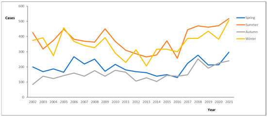 APA StyleGea-Izquierdo, E., Ruiz-Urbaez, R., Hernández-Barrera, V., & Gil-de-Miguel, Á. (2025). Seasonal Dynamics and Legionellosis-Associated Hospitalization in Spain: A Retrospective Study. Pathogens, 14(5), 411. https://doi.org/10.3390/pathogens14050411