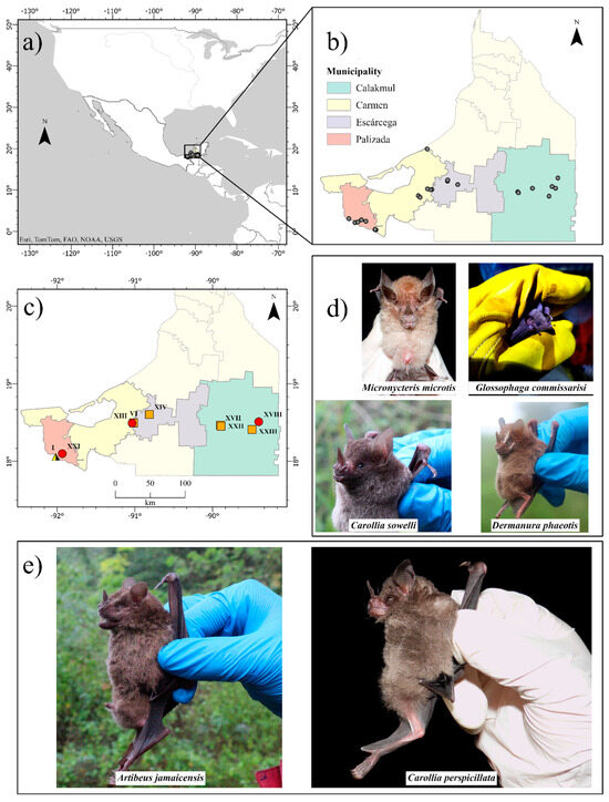 Location of 23 sampling sites in the state of Campeche, Mexico (panels (a,b)). The six bats that tested positive for influenza A antibodies were captured at four sites in three different municipalities, shown in red (sites I, XIII, XVIII, and XXI). The six sites where the six molecularly positive bats were captured are shown in orange (sites I, VI, XIV, XVII, XXII, and XXIII). Only site I, indicated with a triangle, had seropositive and molecularly positive individuals (panel (c)). Positive species are shown in panels (d,e); the latter panel shows the two species with the most positive individuals.