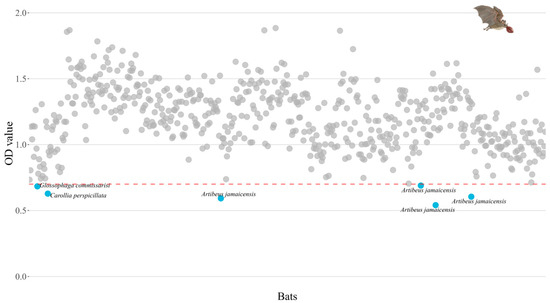 Serological evidence of influenza A virus antibodies in bats from Campeche, Mexico. Blue dots represent the sera that obtained values below the cutoff value (0.7 nm) represented by the red dotted line; these sera are considered positive for the presence of influenza A virus antibodies.