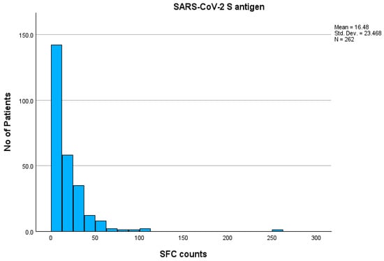 The median SFC count for the S antigen was 10.00 (n = 216, range 0–110) in group A and 16 (n = 46, range 0–253) in group B (Figure 6). The Mann–Whitney test showed a statistically significant difference in SFC count between the different groups, with a mean SFC count of 125.70 for group A and 158.73 for group B (p = 0.006).
