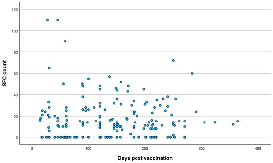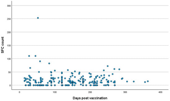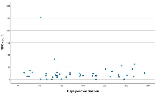 Distribution of T cell response against SARS-CoV-2 S antigen in relation to time period post vaccination in SARS-CoV-2 IgG-negative cases. Abbreviations: S antigen—Spike protein antigen (of SARS-CoV-2); IgG—Immunoglobulin G; SARS-CoV-2—Severe Acute Respiratory Syndrome Coronavirus 2; SFC—spot-forming cell.