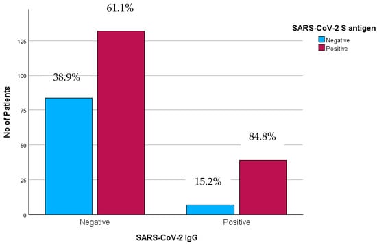 Positivity rate of SARS-CoV-2-specific T cell response among 2 groups. Abbreviations: S antigen—Spike Protein Antigen (of SARS-CoV-2); IgG—Immunoglobulin G; SARS-CoV-2—Severe Acute Respiratory Syndrome Coronavirus 2, No—number.