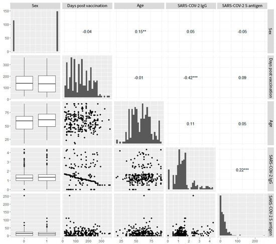 Pair plots. In the diagonal lower half: pairwise scatterplots or whisker plots; on the diagonal: distribution histograms per variable; in the upper half: Spearman’s ρ correlation coefficients for continuous variables or point biserial r coefficient for categorical variables. *** a level of significance < 0.001, ** a level of significance < 0.01. Abbreviations: ρ (Spearman ρ)—Spearman’s rank correlation coefficient (used to measure statistical correlation); r (point biserial r)—point biserial correlation coefficient (used for correlation between a binary and continuous variable).