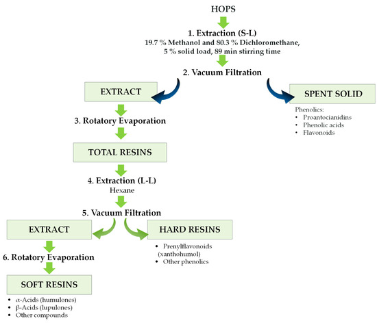 In order to obtain the different types of resins (total, soft, and hard resins) from hops, as well as the spent solids, a process for the extraction and fractionation of their high-value compounds was developed and optimized by Paniagua-García et al. [15]. The optimized sequential extraction procedure (Figure 1) enabled the attainment of maximum recoveries of α-acids and β-acids in soft resins, xanthohumol in hard resins, and phenolics in spent solids. The chemical composition of the four aforementioned fractions, for the six hop varieties, is summarized in Table 2.