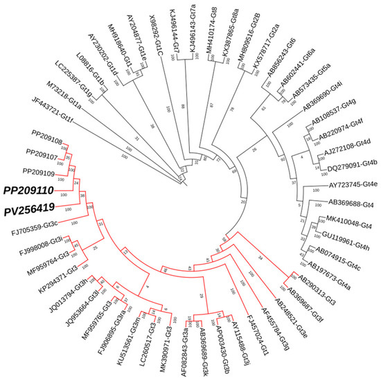 The phylogenetic analysis of ORF-1 HEV sequences collected over a one-year period. The tree was generated via Bayesian inference analysis. The sequence from the follow-up PV256419 is clustered together with the reference sequence genotype 3c (FJ705359-Gt3c); no sequence variation was found compared with the first sampling timepoint: PP209110.