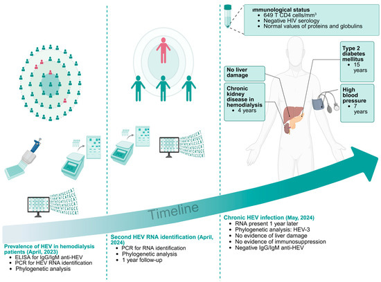 Considering that renal manifestations are commonly found during hepatitis E and that this infection is still neglected in most of these countries, resulting in the lack of inclusion of HEV in the differential diagnosis of kidney disease, the study of HEV in the setting of CKD is necessary. Herein, we followed an incidentally identified HEV RNA-positive patient from a cohort of HD patients, with the aim of identifying elements involved in the characterization of hepatitis E in the kidney, particularly in CKD.