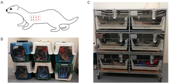 Ferrets were housed in individual cages (Figure 1C) with a 12 h day–night cycle in a temperature- (70–74 °F) and humidity- (30–70%) controlled room. Ferrets were allowed free access to water and a maintenance diet (Marshall BioResources, North Rose, NY, USA). All cages contained a litter pan and toys for environmental enrichment. When removed from their cages for cage cleaning, each ferret was placed into an individual portable carrier assigned to that ferret (Figure 1B) to minimize the potential for carryover of bacteria or bacterial DNA between ferrets during handing. Because of ferret temperament and to ensure the safety of facility staff, all ferret handling was carried out with bite-proof gloves.