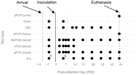 Timeline of experimental events. Test type is shown on the y-axis and study day on the x-axis. Dots indicate date on which the given test occurred. * indicates missing tests due to a lack of serum. Complete blood counts (CBCs) scheduled for PID 14 were performed on PID 13 or 16 due to animal handling and sampling constraints. Chem = serum chemistry panel; CBC = complete blood count; qPCR = quantitative PCR; BAPGM = Bartonella alpha proteobacteria growth medium enrichment culture with qPCR; cPCR = conventional PCR; IFA = B. henselae immunofluorescent antibody assay.