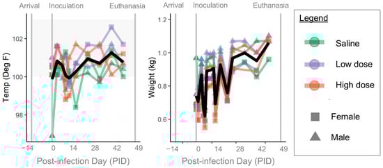 Body temperature and weight throughout the experiment are shown in Figure 6. All ferrets had normal physical exams including normal vital signs prior to experimental infection (PID -8, -5, -1) and prior to inoculation on PID 0. Ferret weights fluctuated but generally increased over the course of the study. No ferret developed a fever; however, one ferret (low-dose female) had a temperature of 102.6 °F on day 35 after inoculation [reference range of 100−104 °F].