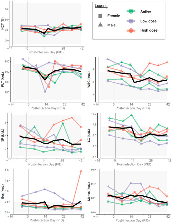 Complete blood count (CBC) results. Colored lines and points indicate individual ferrets; colors show groups (green = saline, purple = low dose, red = high dose) and points show sex (squares = female, triangles = male). Gray shading indicates reference ranges. On each plot, left-most gray vertical line shows the day of arrival, and right-most gray vertical line shows the day of inoculation. Black line shows mean value for each measurement. HCT = hematocrit; PLT = platelet count; WBC = absolute white blood cell count; NP = absolute neutrophil count; LC = absolute lymphocyte count; Eos = absolute eosinophil count; Monos = absolute monocyte count.