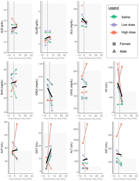 Serum chemistry panel results. Colored lines and points indicate individual ferrets; colors show groups (green = saline, purple = low dose, red = high dose) and points show sex (squares = female, triangles = male). Gray shading indicates reference ranges. On each plot, left-most gray vertical line shows the day of arrival, and right-most gray vertical line shows the day of inoculation. Black line shows mean value for each measurement. ALB = albumin; GLOB = globulins; GLU = glucose; BUN = blood urea nitrogen; CREA = creatinine; CHOL = cholesterol; CK = creatine kinase; ALP = alkaline phosphatase; GGT = gamma-glutamyl transferase; ALT = alanine aminotransferase; AST = aspartate aminotransferase.