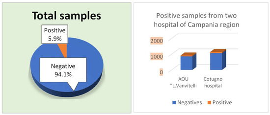 Total samples, Negative and Positive from AOU “L. Vanvitelli” and Cotugno Hospital. From 2050 samples, 5.9% positives were identified through fresh microscopic analysis after Ridley’s concentration and Giemsa staining (O&P).