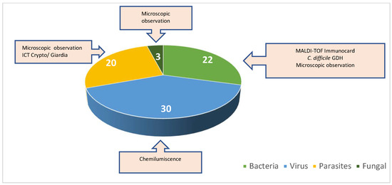 The Novodiag molecular biology system (Hologic) was used for the detection of nucleic acids of the most common parasites, including Ancylostoma duodenalis, Ascaris lumbricoides, Balantidium coli, Blastocystis spp., Diphyllobothrium latum, Clonorchis sinensis, Opisthrochis spp., Cryptosporidium spp., Cyclospora cayetanensis, Cystoisospora belli, Dientamoeba fragilis, Entamoeba histolytica, Enterobius vermicularis, Fasciola spp., Giardia intestinalis, Fasciolopsis buski, Hymenolepis nana, Schistosoma mansoni, Strongyloides stercoralsis, Taenia saginata, Taenia solium, Taenia asiatica, and Thricuris spp. The procedure included the adsorption of a certain amount of feces via the eSwab; then, 1 mL of the fecal solution was inoculated into a tube containing agarose beads, and mechanical lysis of cells was carried out by the MagNALyser (Roche Diagnostics, Indianapolis, IN, USA). The cartridge containing specific PCR sequence primers was filled with 600 μL of the lysed cells, and PCR was performed according to manufacturer’s instructions (94 °C for 4 min; 95 °C for 15 s, 60 °C for 15 s, 72 °C for 30 s, repeated for 30 cycles; 72 °C for 5 min). Finally, the amplified sequences were paired with specific sequence microarrays for a qualitative result (absence/presence of parasitic DNA).