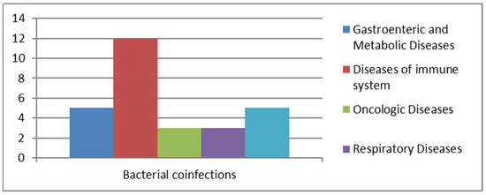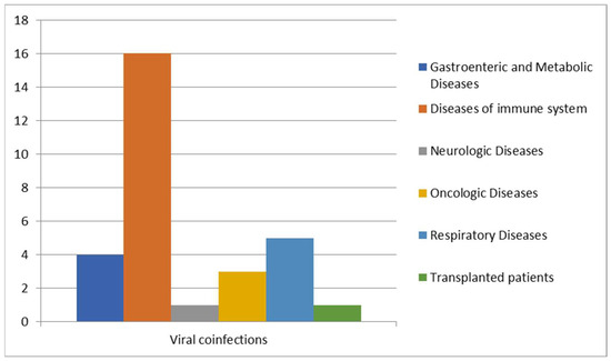 A high prevalence of Blastocystis co-infections was observed in patients with problems of the immune system since people with HIV or with several other irreversible viral infections are the most susceptible [14,23]. Of the 30 patients positive for viral co-infections, like HAV, HBV, adenovirus, CMV, HSV-1 and HSV-2, RSV, EBV, influenzas A and B, Coxsackie virus, SARS-CoV-2, and HIV, 16 patients were affected by immune system problems [24], 5 patients by respiratory diseases, 4 patients by metabolic diseases, 3 patients were oncologic patients, 1 patient was affected by neurological disease, and 1 patient was transplanted.