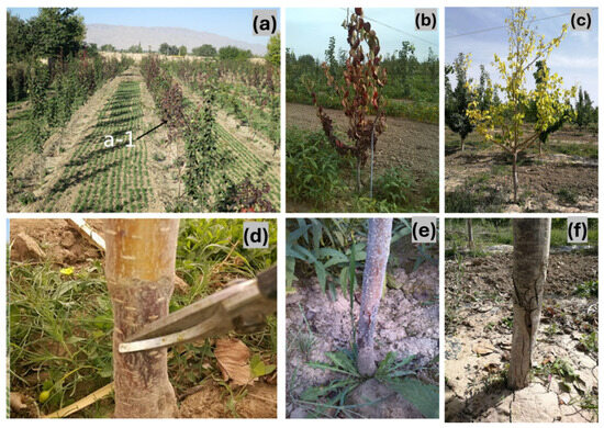 Symptoms of pear dry blight (PDB): (a–c) symptoms on pear tree leaves (a-1 represented diseased plants in the field. The arrow pointed to the diseased plant with red leaves); (d–f) symptoms on pear tree stems.
