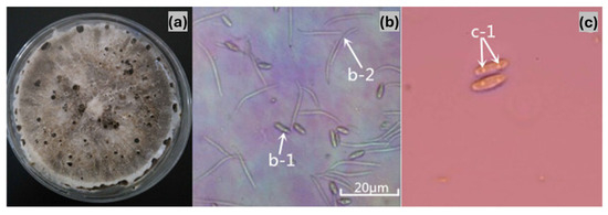 Morphological characteristics of the pear dry blight pathogen. (a) Fungal colony on PDA. (b) Conidia observed under a microscope (a: 40× magnification; b-1: α-conidia; b-2: β-conidia). (c) α-conidia structure (c-1: presence of two intracellular oil globules).