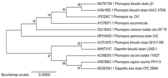 The pathogen’s genomic DNA was amplified using ITS1 and ITS4 primers, yielding a 564 bp sequence. BLASTn analysis revealed a 99% similarity (E = 0.0) to D. fukushii (KU751870), indicating a close genetic relationship. Phylogenetic analysis placed LGKB-1 within a well-supported clade alongside D. fukushii (KU751870) and P. fukushii strains (MG767199, KX641893, KU751870), confirming its genetic affinity (Figure 3). Other related species, including P. vaccinii (KC488259), P. capsici (KR870863), and D. eres (MG281041), formed a distinct lineage within the Diaporthe-Phomopsis complex. The strong phylogenetic clustering of LGKB-1 with D. fukushii, supported by high bootstrap values, further validated its classification. Based on these molecular and morphological characteristics, the pathogen responsible for pear dry blight was identified as D. fukushii. The ITS sequence of LGKB-1 was deposited in the GenBank database under accession number MH973157.