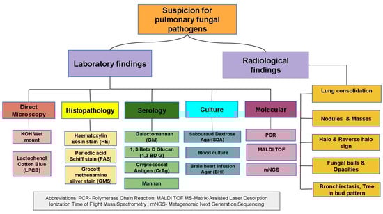 The Fungal Priority Pathogen List released by WHO in 2022 underscores the need for quick measures to prevent, diagnose, and appropriately treat fungal pathogens []. Some of the proven diagnostic tools available for detecting pulmonary mycoses can be broadly categorized into histopathological and culture methods, while radiological, immunological, and molecular techniques are considered for probable diagnosis []. Figure 1 shows diagnostic techniques for suspected pulmonary fungal infections in presumed TB patients who have been microbiologically determined to be non-TB patients, with confirmed possibility of bacterial and viral pneumonias ruled out.