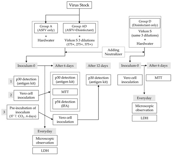 We established three experimental groups to evaluate the virucidal efficacy and cytotoxicity of the disinfectant under various conditions. The ASFV + disinfectant (AD) group was prepared by mixing virus suspension with three different dilutions of Virkon® S (375×, 275×, and 175×) in hard water (CureBio, Seoul, Repblic of Korea). The disinfectant-only (D) group consisted of the same Virkon® S dilutions prepared in hard water without the virus. The ASFV-only (A) group, serving as a virus control, used virus suspension mixed with hard water instead of a disinfectant. As illustrated in Figure 1, the inoculum-0 prepared for each group was divided into three parts. First, a portion was immediately tested for viral antigen using a p30 rapid antigen kit. Second, another portion was directly inoculated onto Vero cells, simulating the standard APQA disinfectant efficacy testing procedure. Third, the remaining inoculum was incubated at 37 °C in a CO2 incubator for 6 days and then inoculated onto Vero cells to evaluate residual infectivity and delayed cytotoxic effects. All inoculum-0 samples were pre-treated with a neutralizer prior to use. Microscopic observation and LDH assays were conducted daily to monitor cytopathic effects and cytotoxicity. On day 6, cell viability was assessed via an MTT assay. Viral replication was further evaluated through p30 antigen detection (days 0, 6, and 12) and a p54 immunofluorescence assay (day 6). This multi-track approach enabled precise differentiation between disinfectant-induced cytotoxicity and virus-induced CPE under time-dependent conditions.