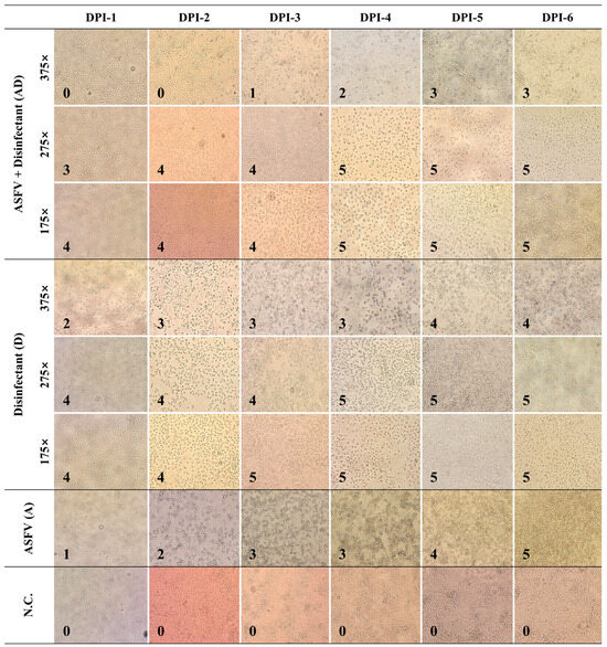The primary objective of this study was to establish a cell-based analytical framework capable of clearly distinguishing virus-induced cytopathic effects (CPEs) from disinfectant-induced cytotoxicity during the evaluation of ASFV disinfectant efficacy. This framework is intended to contribute to more accurate assessments in future disinfectant authorization processes and disease control strategies.