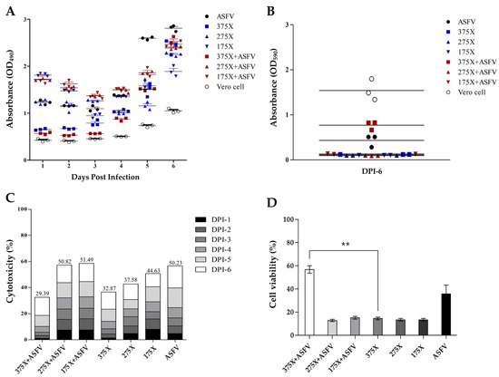 LDH release and MTT assay-based cytotoxicity analysis across experimental groups. (A) Daily LDH release (%) measured over six days (DPI 1–6) to assess cytotoxicity. (B) MTT assay absorbance values on DPI-6 to evaluate cell viability. (C) Cumulative LDH-based cytotoxicity (%) across the experimental period. (D) MTT assay-based cell viability (%) on DPI-6. Statistically significant differences were observed between the 375× + ASFV group and the D 375× group (p < 0.01), as determined by a one-way ANOVA followed by post hoc analysis. Asterisks (**) indicate p < 0.01.
