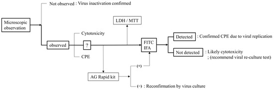 Based on these findings, we propose a multi-parametric evaluation strategy that integrates morphological observation, antigen detection, and LDH/MTT-based cytotoxicity assays (Figure 6). In particular, IFA targeting virus-specific antigens serve as a key tool to accurately determine viral inactivation, even under conditions with ambiguous CPEs or mixed cytotoxicity. While this study employed ASFV p54 as a target antigen, the same approach is readily extendable to other animal viruses using their respective diagnostic or immunogenic antigens—such as the nucleocapsid (N) protein of PEDV, the viral protein 1 (VP1) of FMDV, or the nucleoprotein (NP) of AIV.